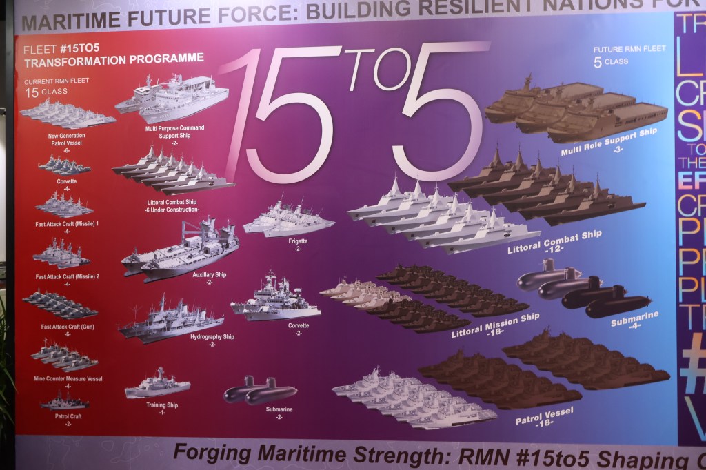 Another no-show at DSI was Boustead Heavy Industries Corporation (BHIC), the prime contractor for the Royal Malaysian Navy (RMN) Littoral Combat Ship (LCS), a stealth frigate. That programme became mired in scandal and delay, as I mentioned two years ago. The first of five vessels (reduced from the original six) is not now due to be delivered until 2026 – six years late. The government has nationalised Bousted Naval Shipyard as Lumut Naval Shipyard (which did exhibit), to get the other ships completed. Incidentally, the RMN had a fancy stand at DSA that contained large panels of graphics portraying an optimistically large future fleet inventory.(below)