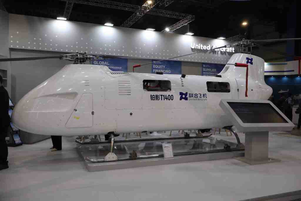 At the United Aircraft stand, I saw much deferential bowing by staff, when a high-level delegation from the PLA stopped by. As at previous shows, this group displayed interesting UAS developments. The stand was dominated by a full-scale model of a large tandem rotor unmanned heavy-lift helicopter designated T1400. It is 6.6 metres long, and can fly for 200km with a payload of 650kg (including fuel).